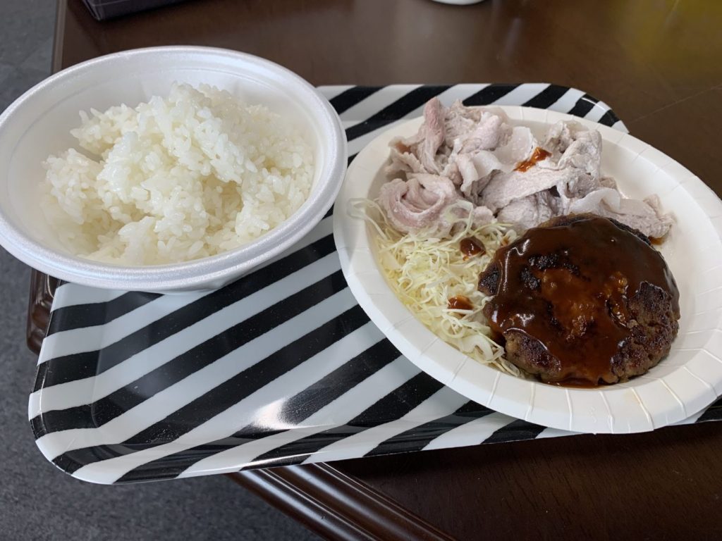 マツゲンのハンバーグ150gは閉店間際に行って半額、豚コマ120gは特売、メシ1合