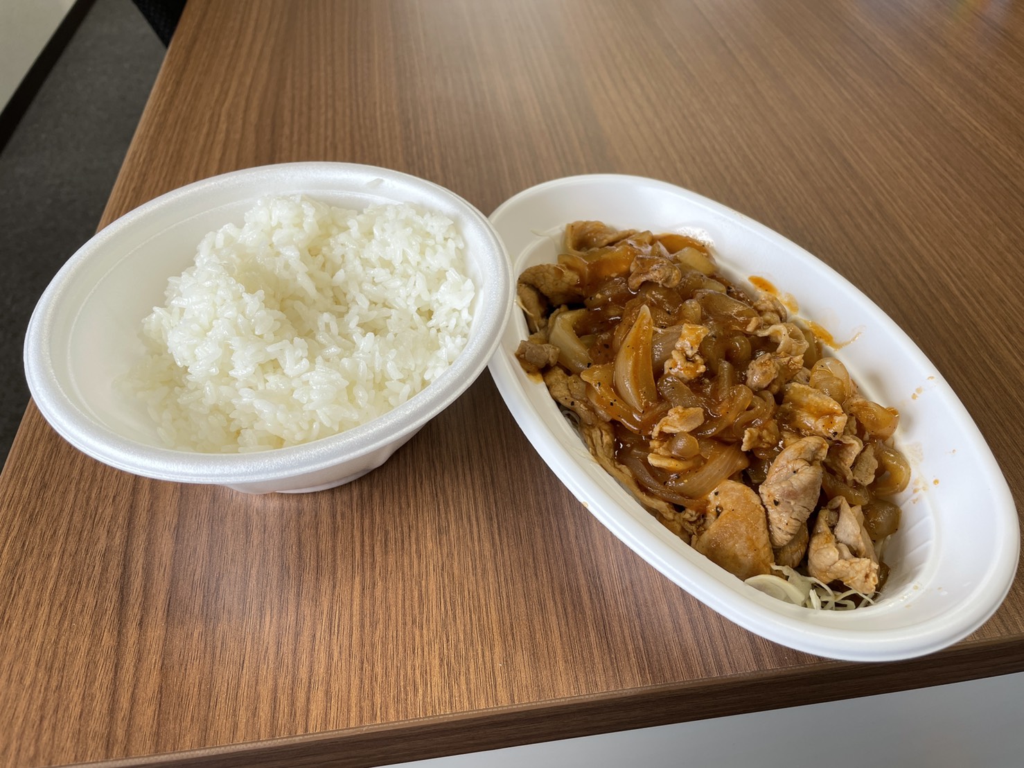 特売の豚コマ150g、玉ねぎ、メシ1合