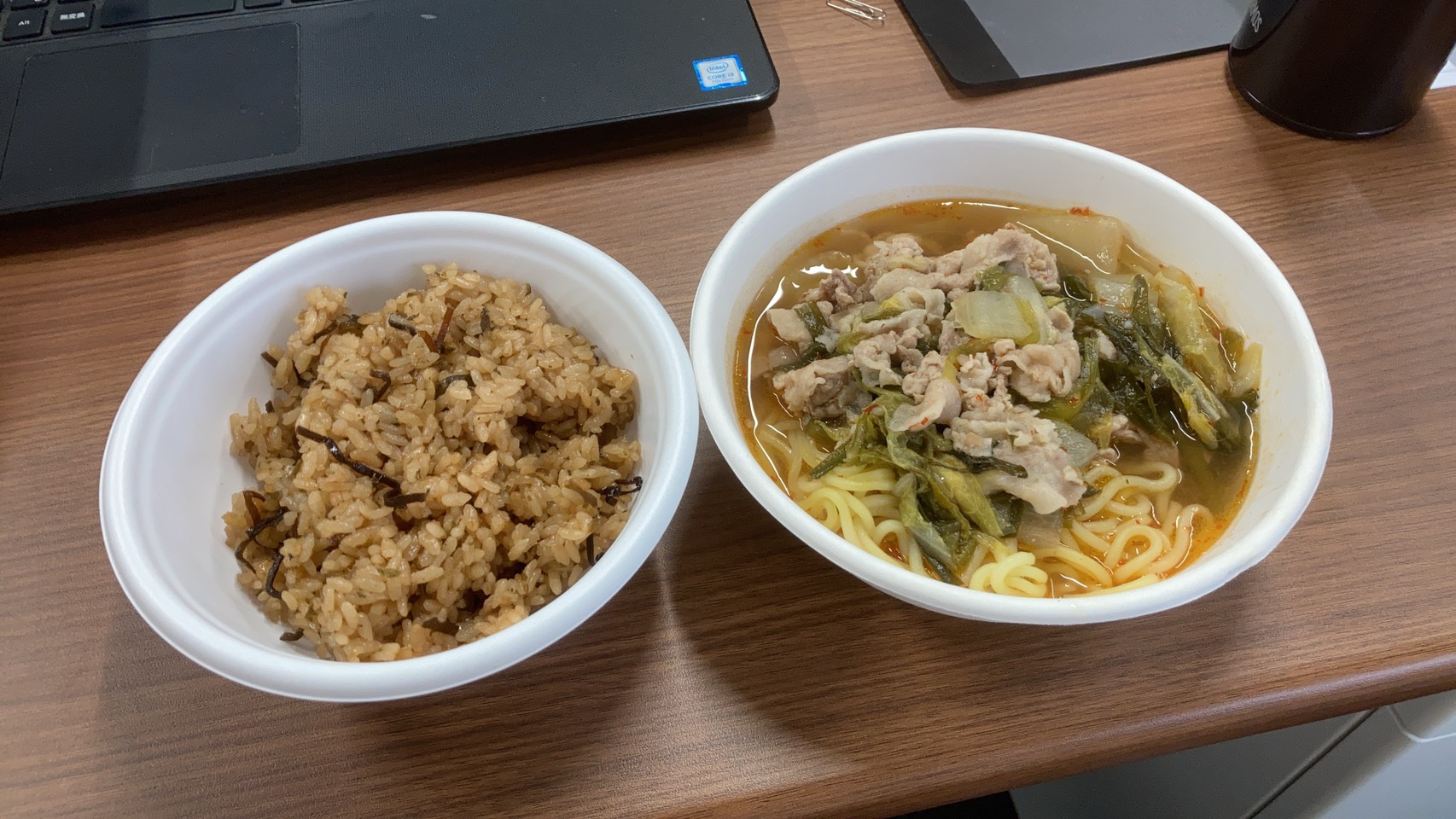 彩華風ラーメンと塩昆布ウーロン茶炊き込みご飯