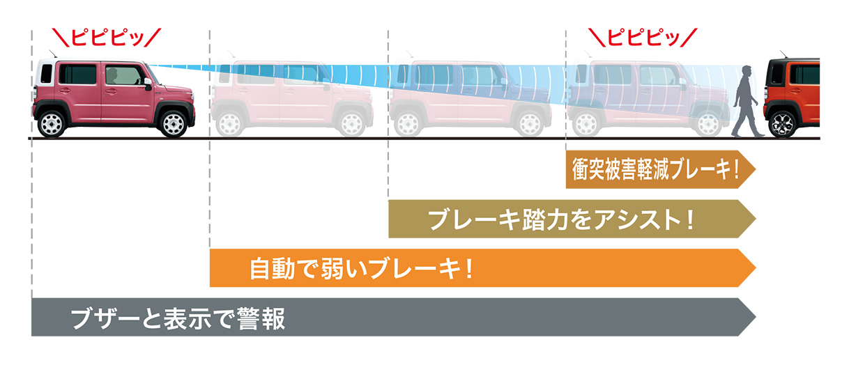 さらに衝突の可能性が高まると、自動で強いブレーキをかけ、衝突の回避または衝突時の被害軽減を図ります。